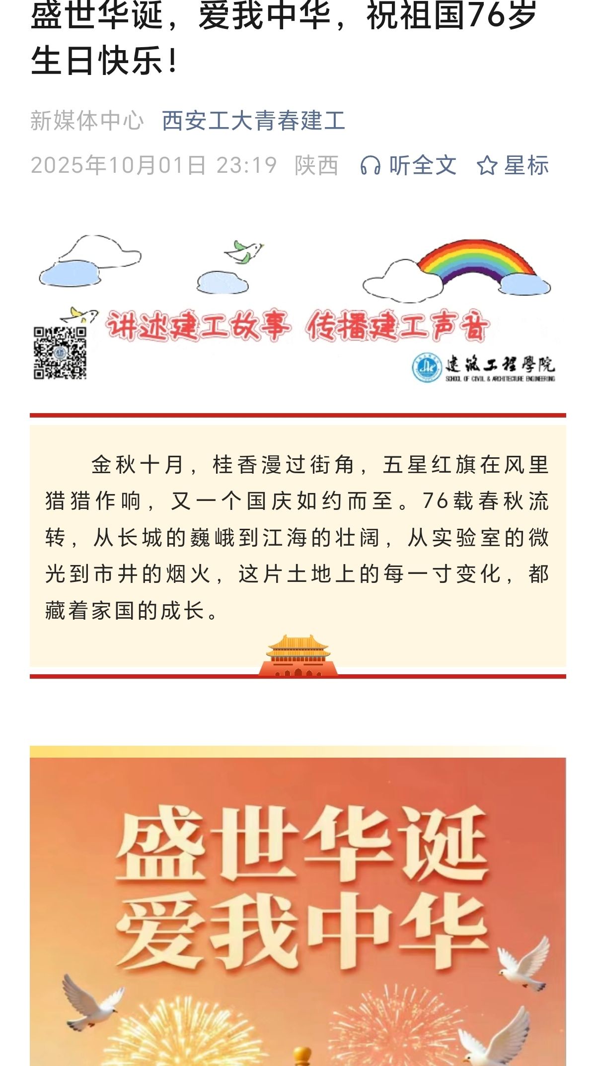 为庆祝中华人民共和国成立76周年,营造浓厚的爱国氛围,建筑工程学院于国庆期间依托“西安工大青春建工”微信公众号,正式推出“华诞传祝福”线上专题活动,汇聚全院师生对祖国的美好祝愿。