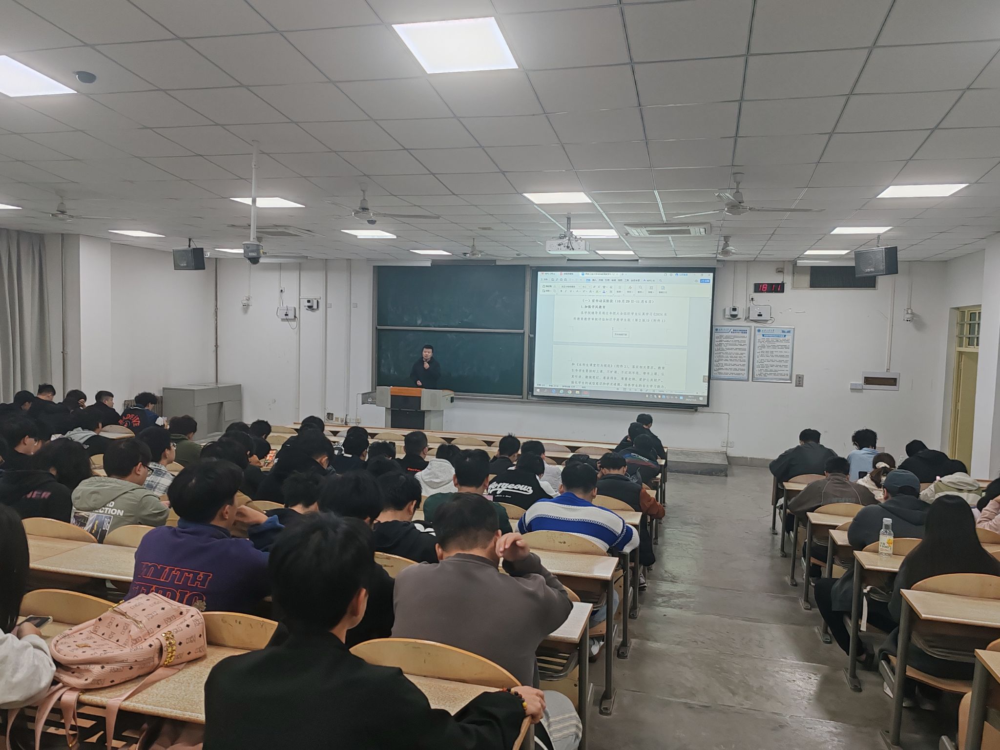 会上,刘冬老师首先详细解读了学校本科教育教学审核评估的重要意义,要求全体同学以高度的责任感和使命感投入到迎评工作中。他带领同学们认真学习了《本科生课堂行为规范》等文件,重点强调了课堂纪律、考风考纪、学习态度等方面的具体要求,希望同学们自觉遵守规章制度,展现建工学子良好的精神风貌。