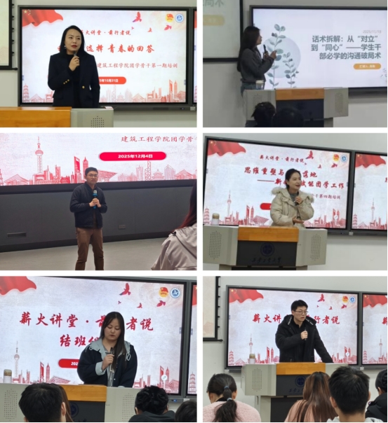 经济管理学院崔弘以“我们的选择,青春的回答”为主题,强调初心使命与实干价值,引导骨干杜绝功利化、官僚化风气;机电工程学院高珊以“话术拆解:从对立到同心学生干部必学的沟通破局术”为主题,聚焦沟通难题,传授“共情沟通三步骤”及实用工具;西安圣彼得堡理工学院侯剑波以“一个‘工具人’的觉醒叙事”为主题,分享成长历程,以“先干事、干实事”诠释团学工作的能力锤炼价值;新生院刘叶以“思维重塑与技能落地——新媒体赋能团学工作”为主题,围绕新媒体赋能,讲解实用技能,推动宣传工作提质转型。两位学生代表李芝番、锁静在结班仪式上分享了所学所思、所感所悟。