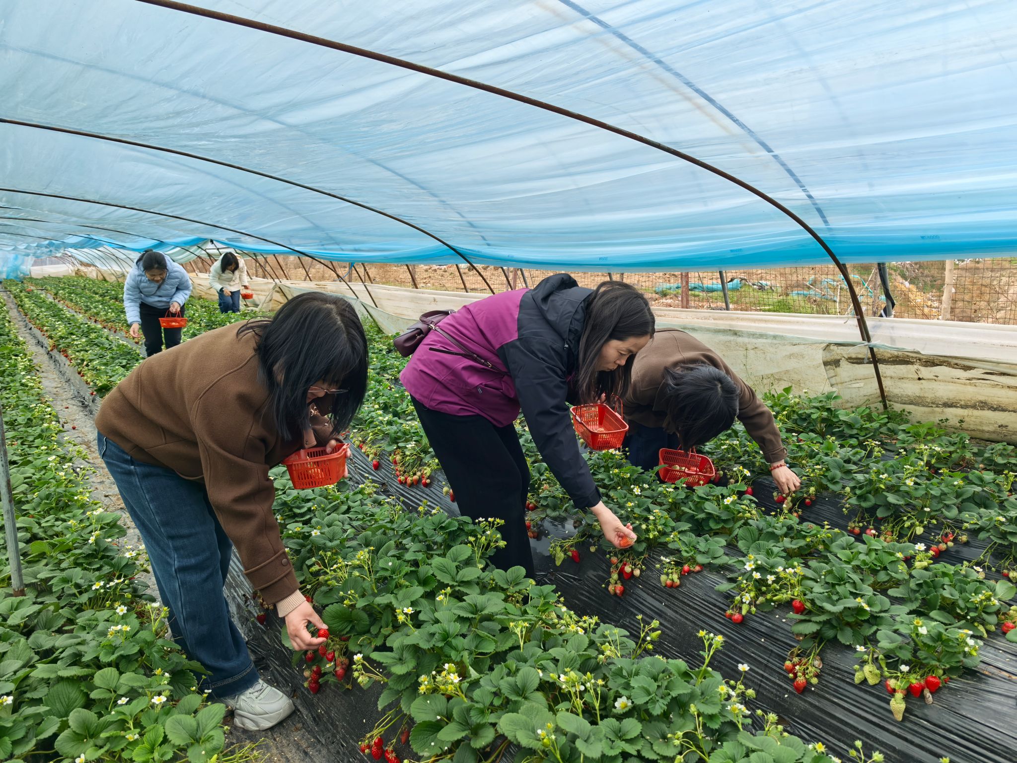暖棚之内,绿意盎然,生机勃发。一颗颗鲜红饱满的草莓掩映在青叶之间,平日里深耕讲台、严谨治学、悉心育人的女教师们,暂时放下忙碌的工作,漫步垄间、轻摘细选,在自然田园中放松身心,在欢声笑语中交流互动。大家一边采摘新鲜草莓,一边畅谈工作生活、分享育人心得,现场气氛轻松愉悦、暖意融融。